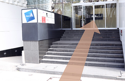 階段を上がり、自動ドアを抜けてお進みください。
