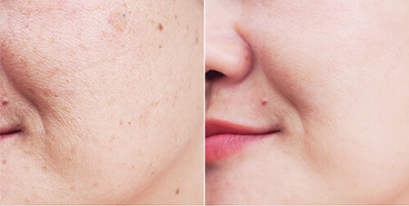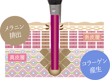 フラクショナル照射は、真皮層に極小の穴を作ることで、修復作用によるコラーゲンやエラスチンの産生を活性化し、ニキビ跡や凸凹肌、毛穴の引き締め、小じわを改善し、綺麗な肌に生まれ変わらせます。