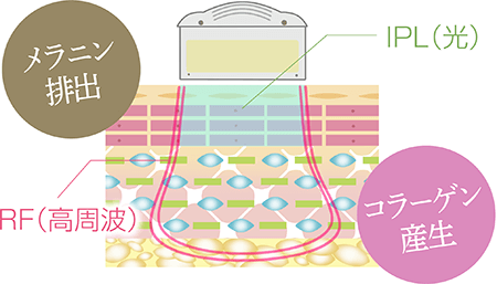 IPLは肌表面のシミや赤み、毛穴などに効果を発揮し、RFは真皮層に働きかけてコラーゲンの生成を促進することで、美肌・美白からタイトニングまで複数の肌の悩みに同時にアプローチできます。