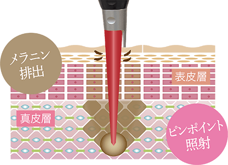 メラニン色素にのみ反応するため、周囲の皮膚へのダメージを最小限に抑えたシミ・美肌治療ができます。